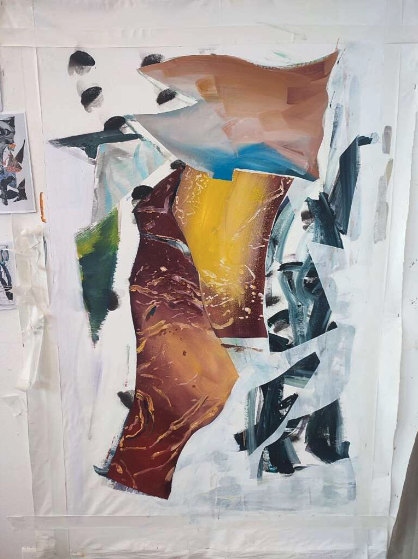 When I layer a painting until earlier strata disappear, I am constructing a different logic of meaning. Erasure, in this sense, is not reactionary, nor is it a refusal staged for interpretation. Let me explain. My process begins with various image sources: images I have engaged with throughout my practice, paintings by other artists, or fragments of older works of mine. I build the initial layer quickly using acrylics, then proceed through drawing and repainting. I consistently use pieces of masking vinyl to cover parts of the surface, which allows traces of previous layers to remain visible in the next. These vinyls are reused until their adhesive fails. Over time, they accumulate layers of paint from multiple works, carrying unconscious, accidental gestures.