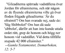 A password, un mot de passe: hudfärgen i Sydafrika, Davidstjärnan under nazismen, glasögonen under Pol Pot, passet för så kallade “illegala flyktingar” vid EU:s murar. Och så vidare. Rätt shibboleth öppnar upp de viktiga portarna; fel kan betyda att du inte har någon morgondag. I Libanon upprepas tragedin vid floden Jordan. Så beskriver journalisten Robert Fisk hur falangisten och maronitledaren Bashir Gemayel i början av kriget – efter att fyra kristna hittats dödade i en bil i december 1975 – gav sina män order om att döda de första fyrtio muslimerna i sikte. De satte sålunda upp en vägspärr och skar halsen av alla som inte kunde visa att de var kristna. Denna så kallade svarta lördag räknar snart mer än tre hundra dödade. Taktiken blir sedan legio.