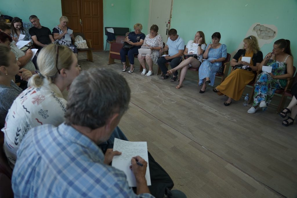 Residents of Yahidne village, who survived being held captive by Russian troops in the local school basement for 27 days, taking part in a discussion on their memories of the events they endured. The meeting was organized by the Public Interest Journalism Lab in July 2024. Photo by Maksym Savchenko