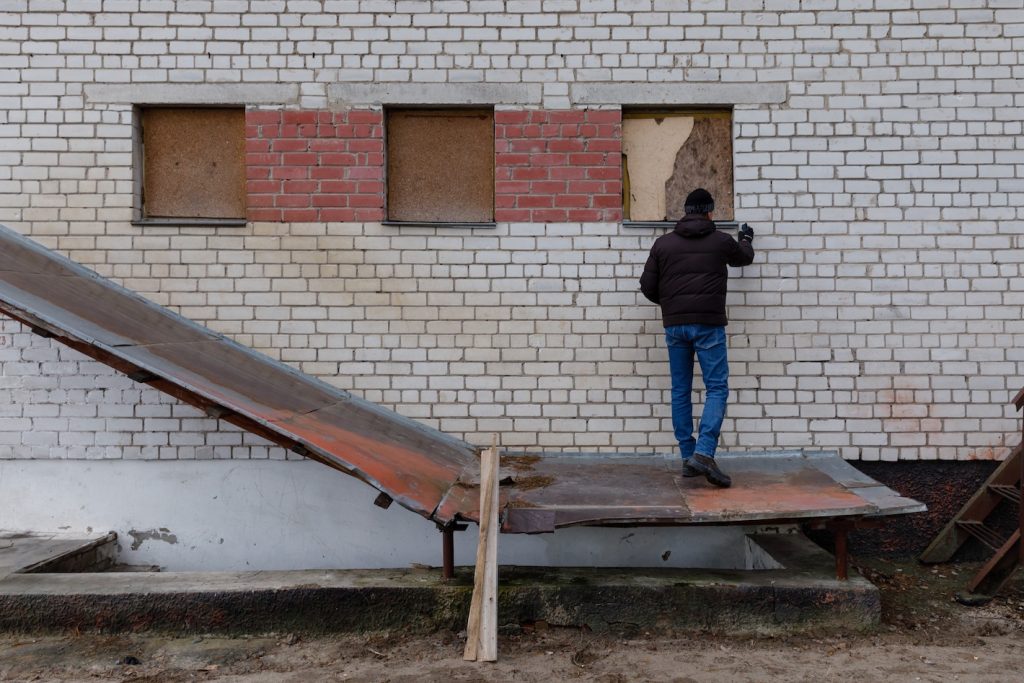 A construction worker takes measurements at the Yahinde school building, which is currently under reconstruction as a museum of war crimes. Photo by Mykaylo Palinchak, 8 January 2025