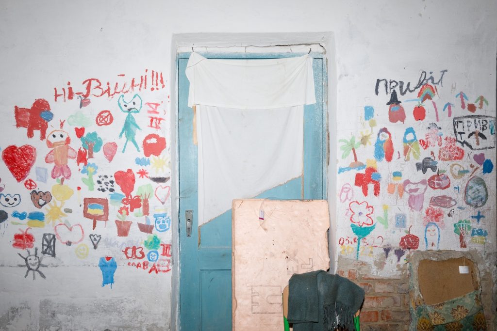 The basement remains damp – if not outright wet. Mold covers the walls. It is creeping toward the drawings that children had made during captivity: hearts, cats, blue-and-yellow flags and the words ‘no to war’. Nearby, adults had scratched their names into the walls, written down the dates of their neighbours’ deaths.